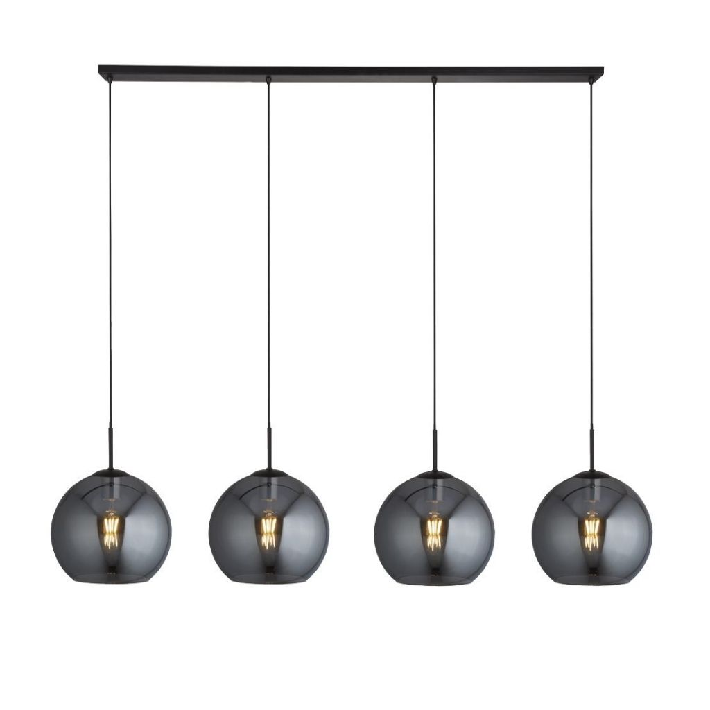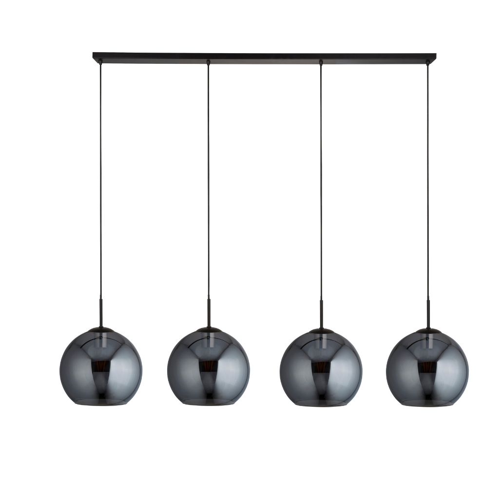 Searchlight závěsné svítidlo barva černá a kouřové sklo, povrchová úprava matný práškový lak, použitý materiál je měkká ocel a sklo. Rozměry v cm: celková výška: 241, výška: 37, šířka: 30, délka: 175,5, projekce: 0. Světelný zdroj objímka E27, potřeba žárovek 4, světelný zdroj není v balení, doporučený typ žárovky od výrobce je klasická baňka na max. 60W.