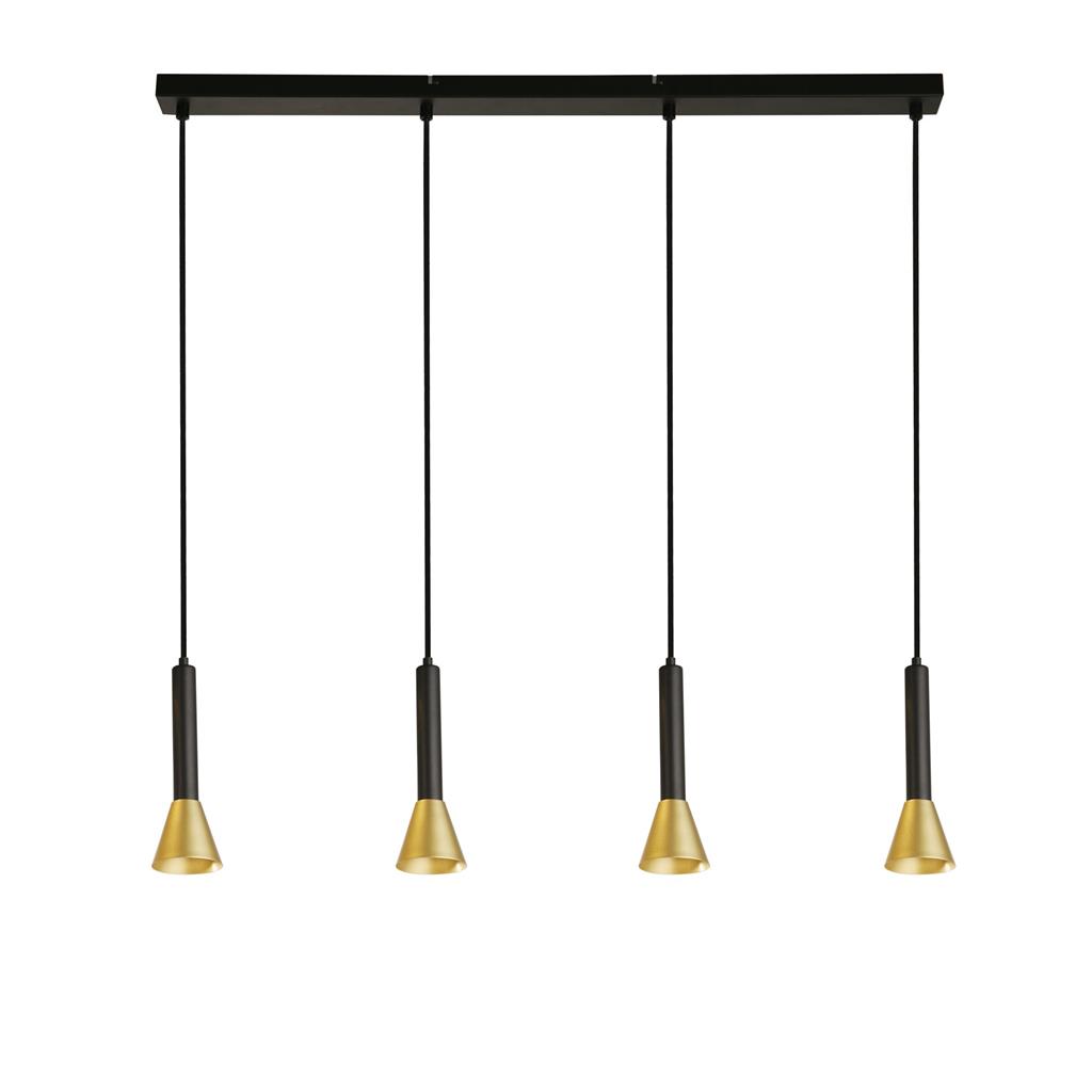 Searchlight závěsné svítidlo barva černá a zlatá, povrchová úprava matný práškový lak, použitý materiál je měkká ocel. Rozměry v cm: celková výška: 150, výška: 28, šířka: 84, délka: 9, projekce: 0. Světelný zdroj objímka GU10, potřeba žárovek 4, světelný zdroj není v balení, doporučený typ žárovky od výrobce je GU10 na max. 50W.