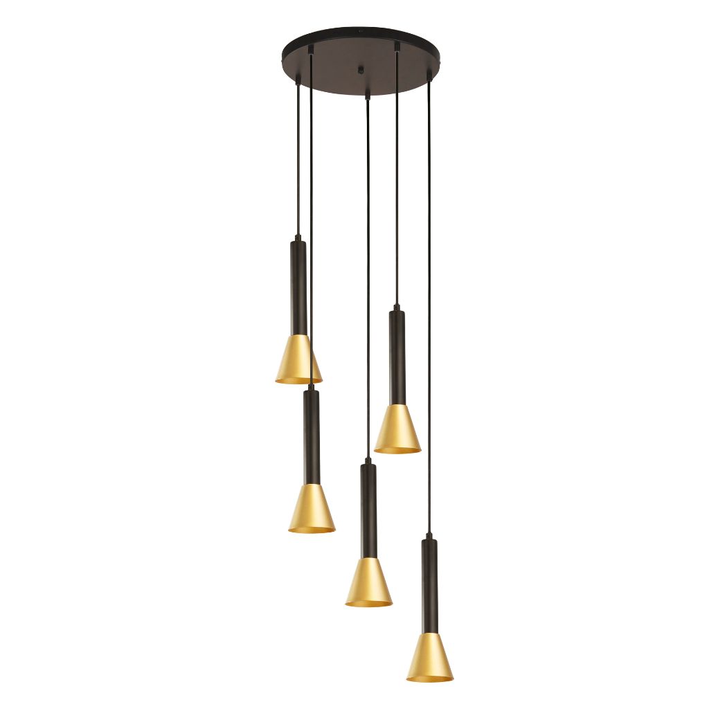 Searchlight závěsné svítidlo barva černá a zlatá, povrchová úprava matný práškový lak, použitý materiál je měkká ocel. Rozměry v cm: celková výška: 150, výška: 28, šířka: 37, délka: 37, projekce: 0. Světelný zdroj objímka GU10, potřeba žárovek 5, světelný zdroj není v balení, doporučený typ žárovky od výrobce je GU10 na max. 50W.