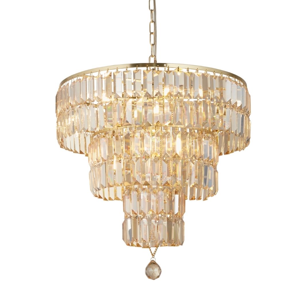 Searchlight závěsné svítidlo barva mosaz, povrchová úprava pokovení matované, použitý materiál je měkká ocel a sklo. Rozměry v cm: celková výška: 150, výška: 45, šířka: 50, délka: 50, projekce: 0. Světelný zdroj objímka E14, potřeba žárovek 5, světelný zdroj není v balení, doporučený typ žárovky od výrobce je svíčka na max. 60W.