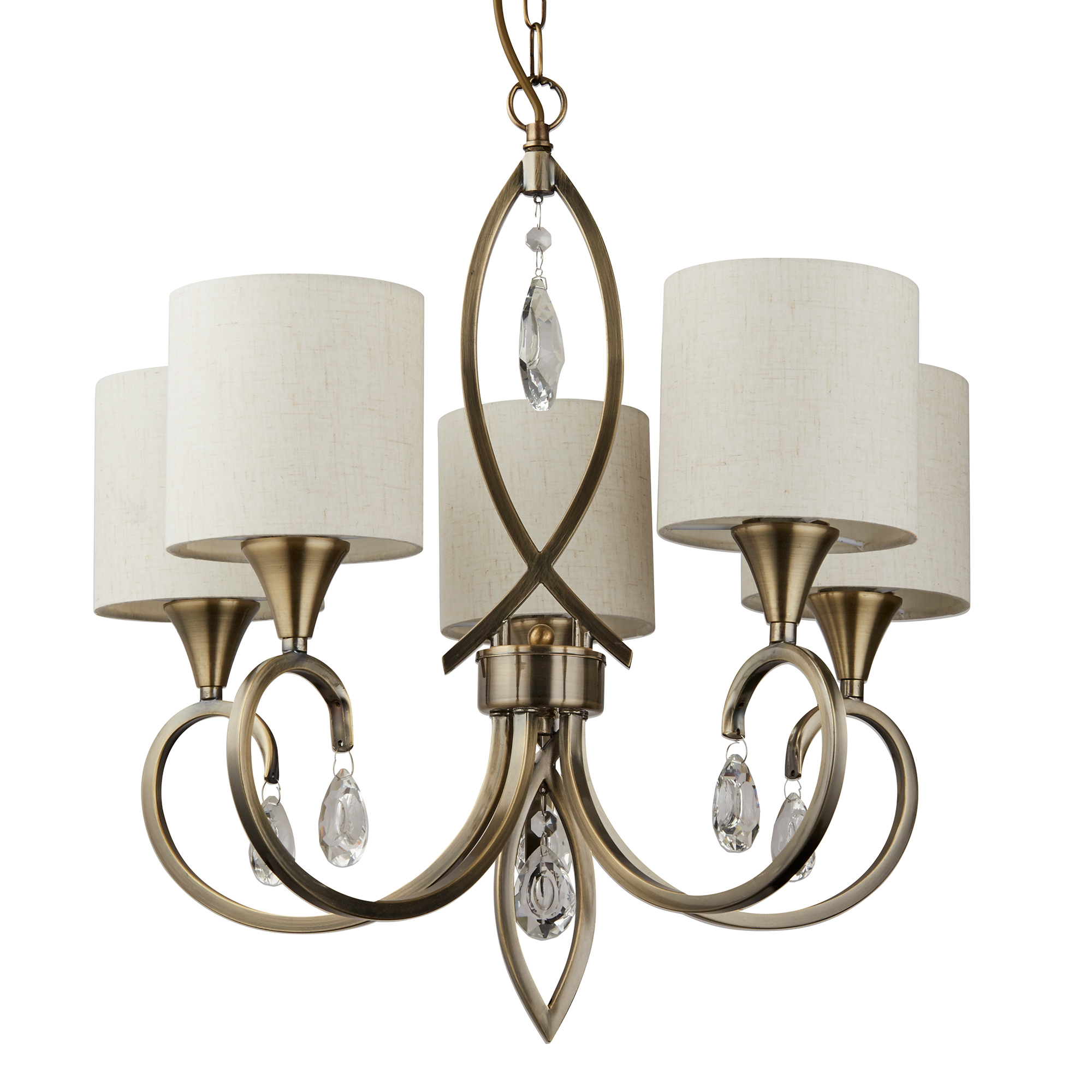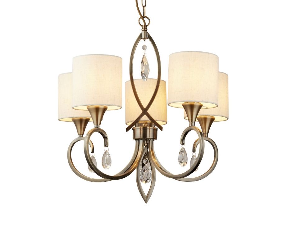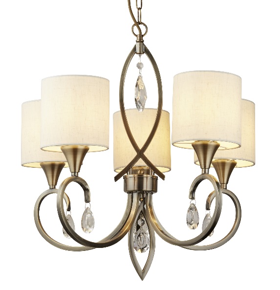 Závěsné dekorativní svítidlo z kovu v provedení antická mosaz. Patice zdroje je E14 a na maximální příkon 5x7W žárovky LED.