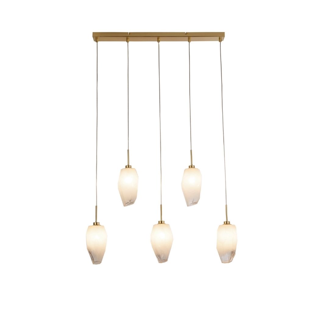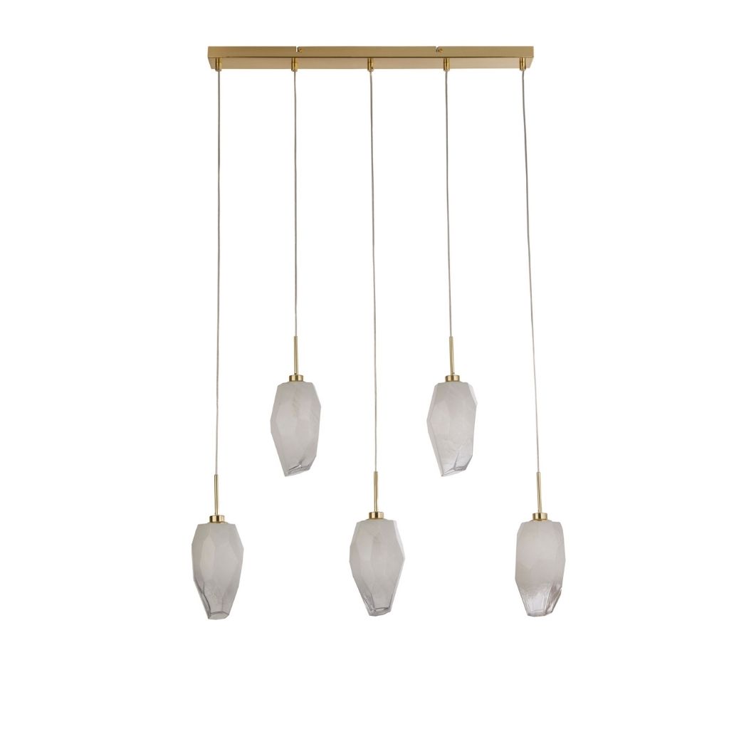 Searchlight závěsné svítidlo barva matná mosaz, povrchová úprava pokovení matné, použitý materiál je měkká ocel a sklo. Rozměry v cm: celková výška: 120, výška: 29, šířka: 11, délka: 78, projekce: 0. Světelný zdroj objímka G9, potřeba žárovek 5, světelný zdroj není v balení, doporučený typ žárovky od výrobce je G9 na max. 33W.