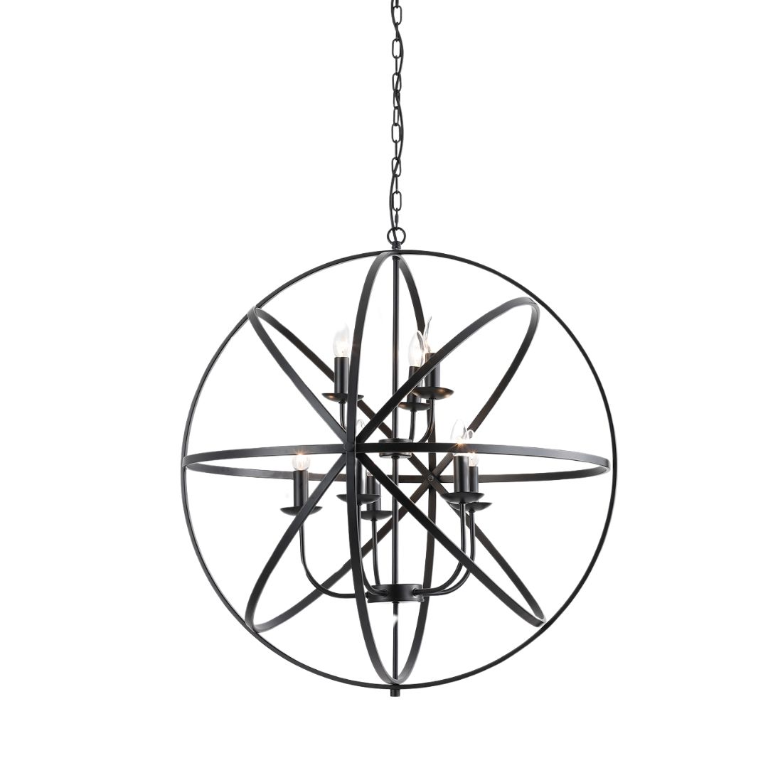 Searchlight závěsné svítidlo barva černá, povrchová úprava barvení matné, použitý materiál je měkká ocel. Rozměry v cm: celková výška: 209, výška: 86, šířka: 82, délka: 82, projekce: 0. Světelný zdroj objímka E14, potřeba žárovek 8, světelný zdroj není v balení, doporučený typ žárovky od výrobce je svíčka na max. 60W.