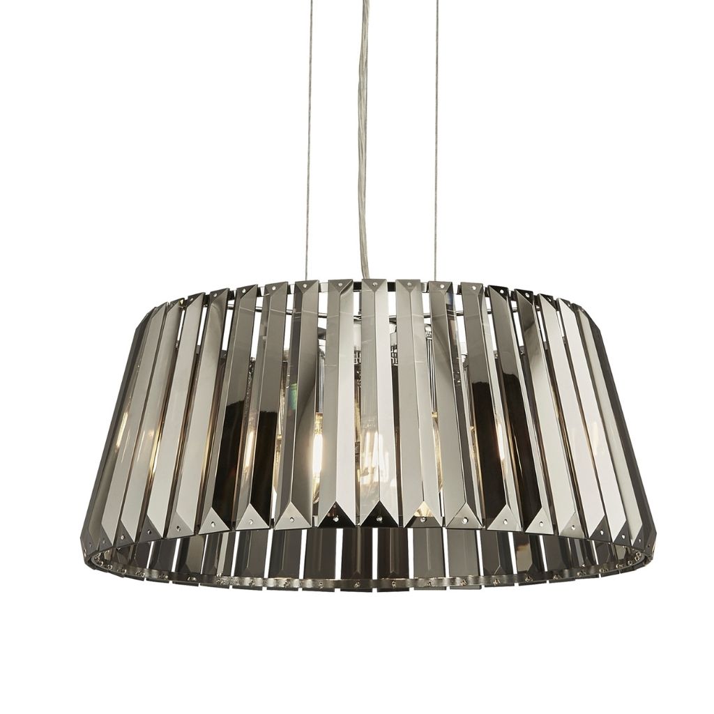 Searchlight závěsné svítidlo barva chrom a kouřová, povrchová úprava pokovení lesk, použitý materiál je měkká ocel a křišťál. Rozměry v cm: celková výška: 150, výška: 22, šířka: 46, délka: 46, projekce: 0. Světelný zdroj objímka E14, potřeba žárovek 5, světelný zdroj není v balení, doporučený typ žárovky od výrobce je svíčka na max. 60W.