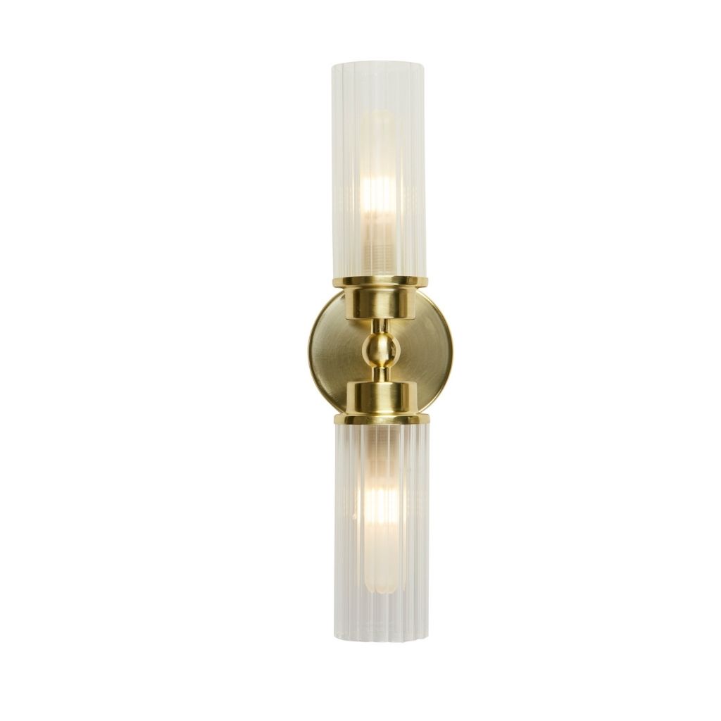 Searchlight nástěnné svítidlo barva matná mosaz a čirá žebrovaná, povrchová úprava pokovení matované, použitý materiál je sklo a kov. Rozměry v cm: celková výška: 10, výška: 10, šířka: 14, délka: 37, projekce: 14. Světelný zdroj objímka G9, potřeba žárovek 2, světelný zdroj není v balení, doporučený typ žárovky od výrobce je G9 na max. 7W.