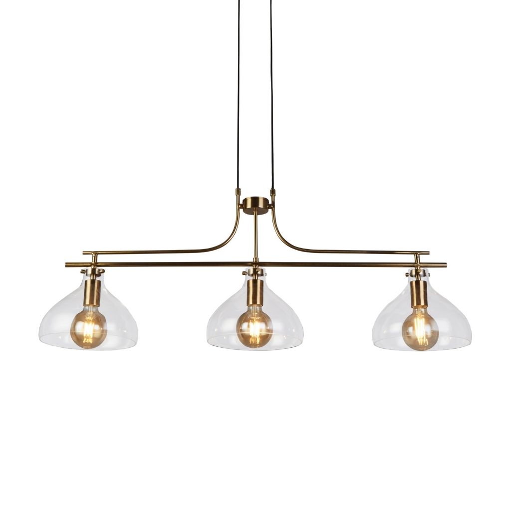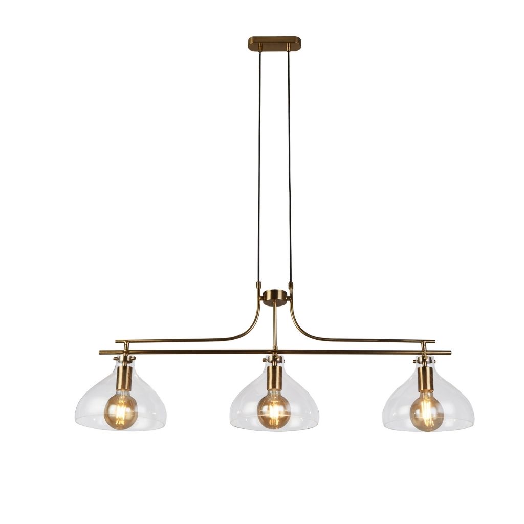 Searchlight závěsné svítidlo barva mosaz, povrchová úprava pokovení matované, použitý materiál je měkká ocel a sklo. Rozměry v cm: celková výška: 120, výška: 42, šířka: 25, délka: 110, projekce: 0. Světelný zdroj objímka E27, potřeba žárovek 3, světelný zdroj není v balení, doporučený typ žárovky od výrobce je klasická baňka na max. 60W.