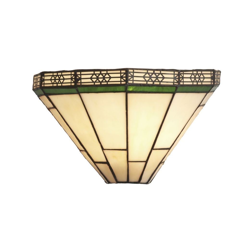 Searchlight nástěnné svítidlo barva perleťová černá a zelená, povrchová úprava barvení, použitý materiál je měkká ocel, Tiffany sklo. Rozměry v cm: celková výška: 18, výška: 18, šířka: 30,5, délka: 0, projekce: 16. Světelný zdroj objímka E14, potřeba žárovek 1, světelný zdroj není v balení, doporučený typ žárovky od výrobce je svíčka na max. 60W.