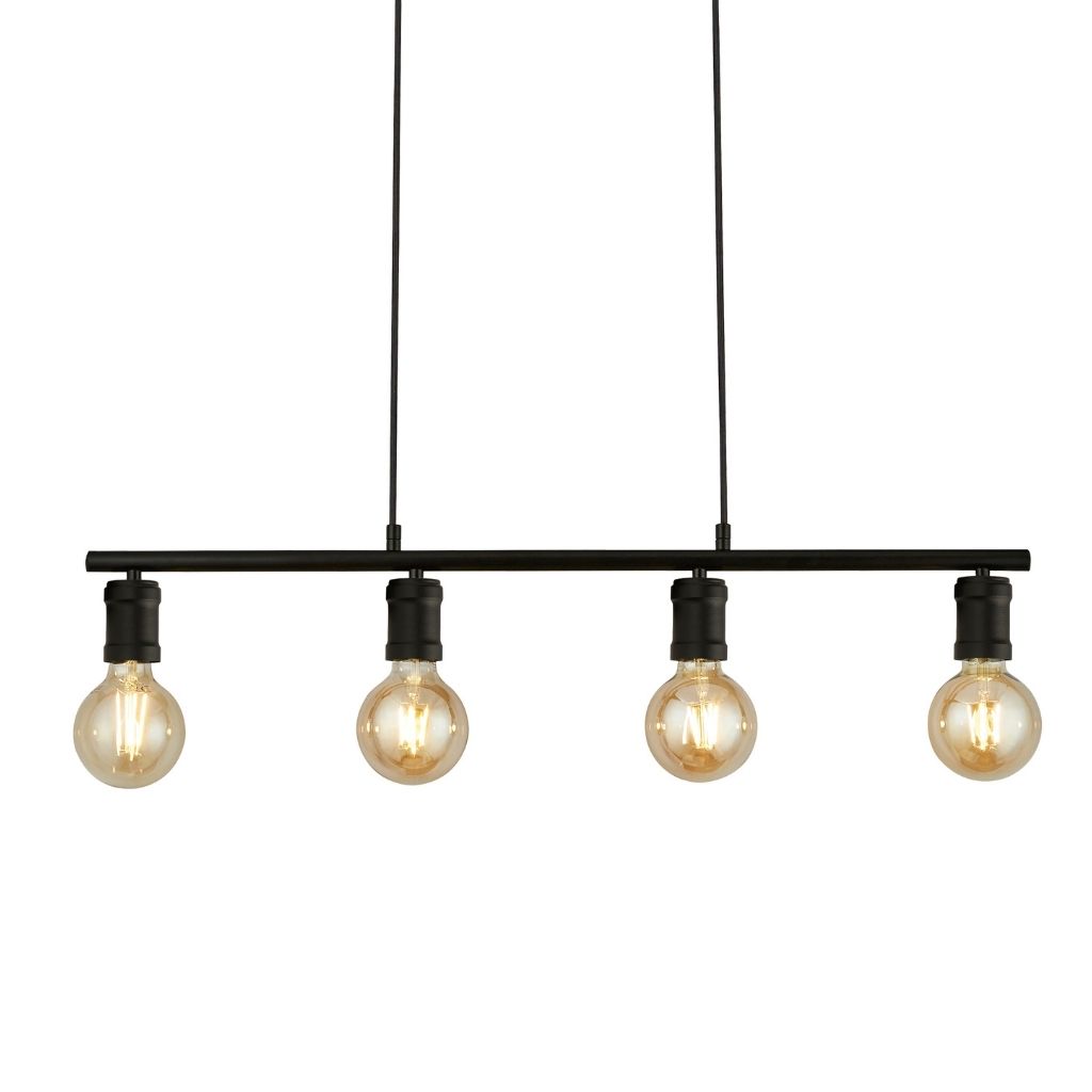 Searchlight závěsné svítidlo barva matná černá a černá, povrchová úprava barvení, použitý materiál je měkká ocel. Rozměry v cm: celková výška: 120, výška: 12, šířka: 5,5, délka: 80, projekce: 0. Světelný zdroj objímka E27, potřeba žárovek 4, světelný zdroj není v balení, doporučený typ žárovky od výrobce je klasická baňka na max. 60W.