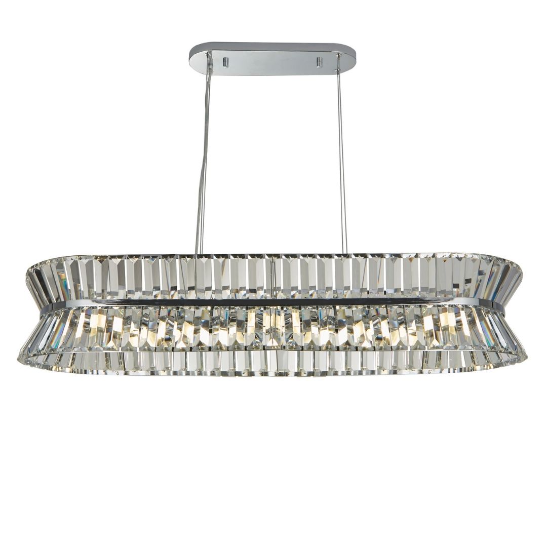 Searchlight závěsné svítidlo barva chrom a čirá, povrchová úprava pokovení lesk, použitý materiál je měkká ocel a sklo. Rozměry v cm: celková výška: 150, výška: 18, šířka: 31, délka: 100, projekce: 0. Světelný zdroj objímka G9, potřeba žárovek 10, světelný zdroj není v balení, doporučený typ žárovky od výrobce je G9 na max. 33W.
