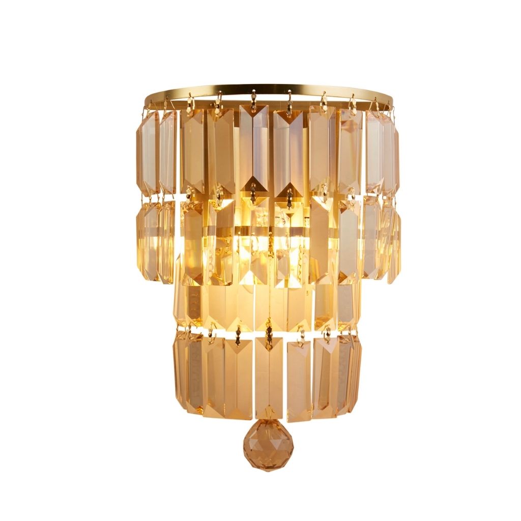 Searchlight nástěnné svítidlo barva matná mosaz, povrchová úprava pokovení, použitý materiál je měkká ocel a křišťál. Rozměry v cm: celková výška: 30, výška: 30, šířka: 20, délka: 0, projekce: 13. Světelný zdroj objímka E14, potřeba žárovek 2, světelný zdroj není v balení, doporučený typ žárovky od výrobce je svíčka na max. 7W.