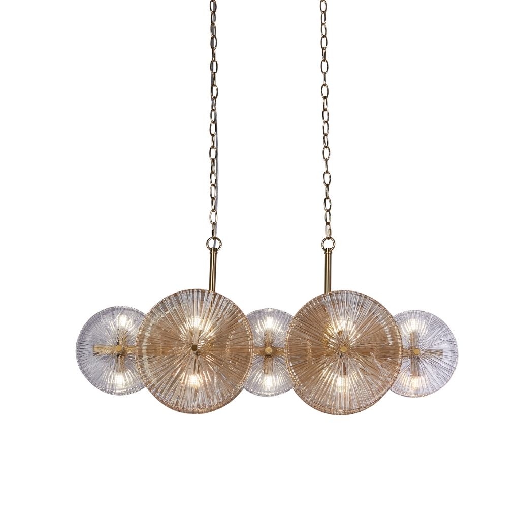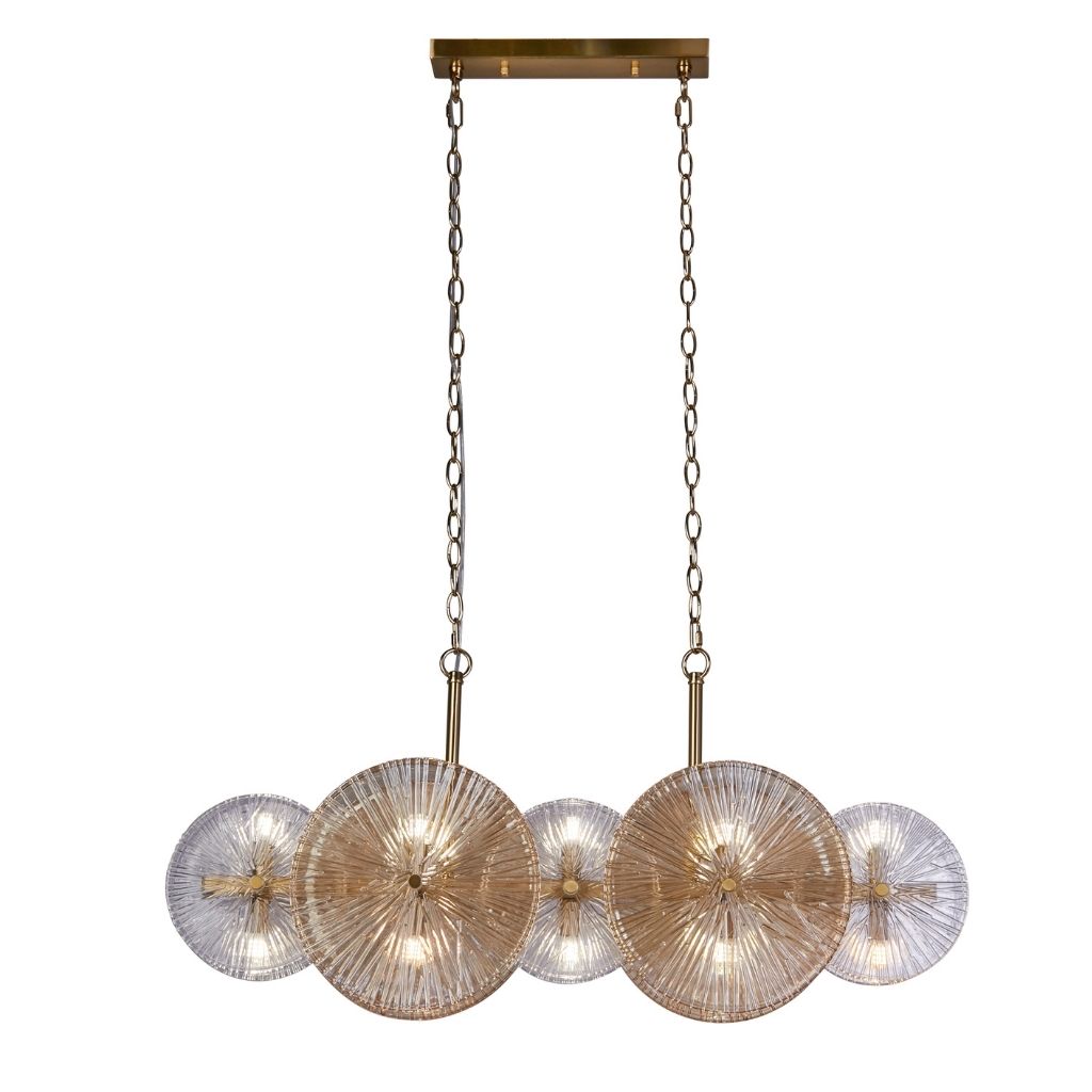 Searchlight závěsné svítidlo barva mosaz, povrchová úprava pokovení matované, použitý materiál je měkká ocel a sklo. Rozměry v cm: celková výška: 120, výška: 40, šířka: 16, délka: 90, projekce: 0. Světelný zdroj objímka G9, potřeba žárovek 10, světelný zdroj není v balení, doporučený typ žárovky od výrobce je G9 na max. 33W.