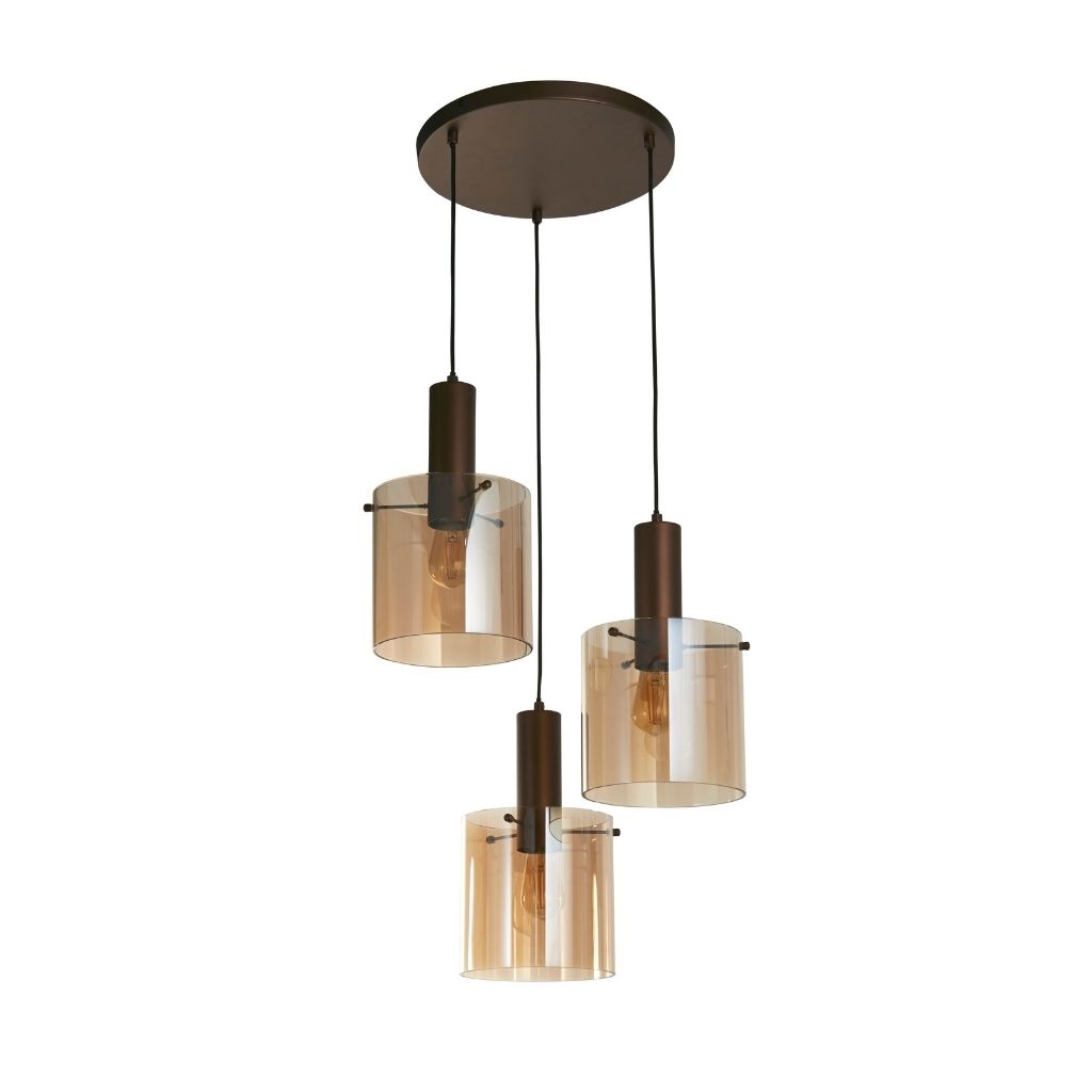 Searchlight závěsné svítidlo barva kávová, povrchová úprava pokovení matované, použitý materiál je měkká ocel a sklo. Rozměry v cm: celková výška: 150, výška: 35, šířka: 47, délka: 47, projekce: 0. Světelný zdroj objímka E27, potřeba žárovek 3, světelný zdroj není v balení, doporučený typ žárovky od výrobce je klasická baňka na max. 60W.