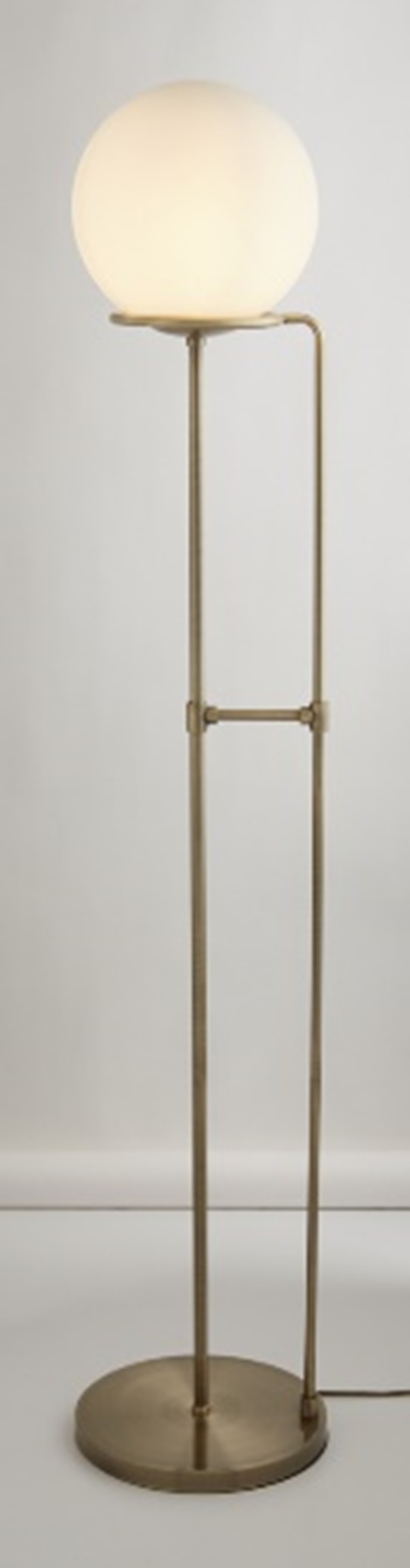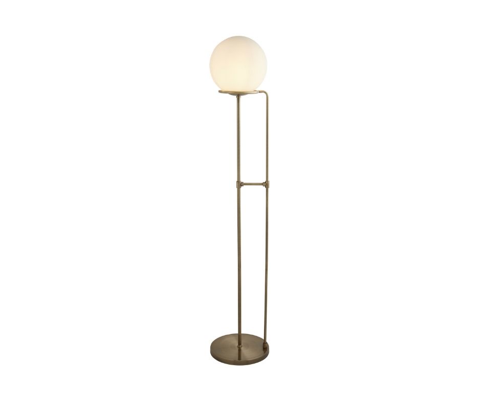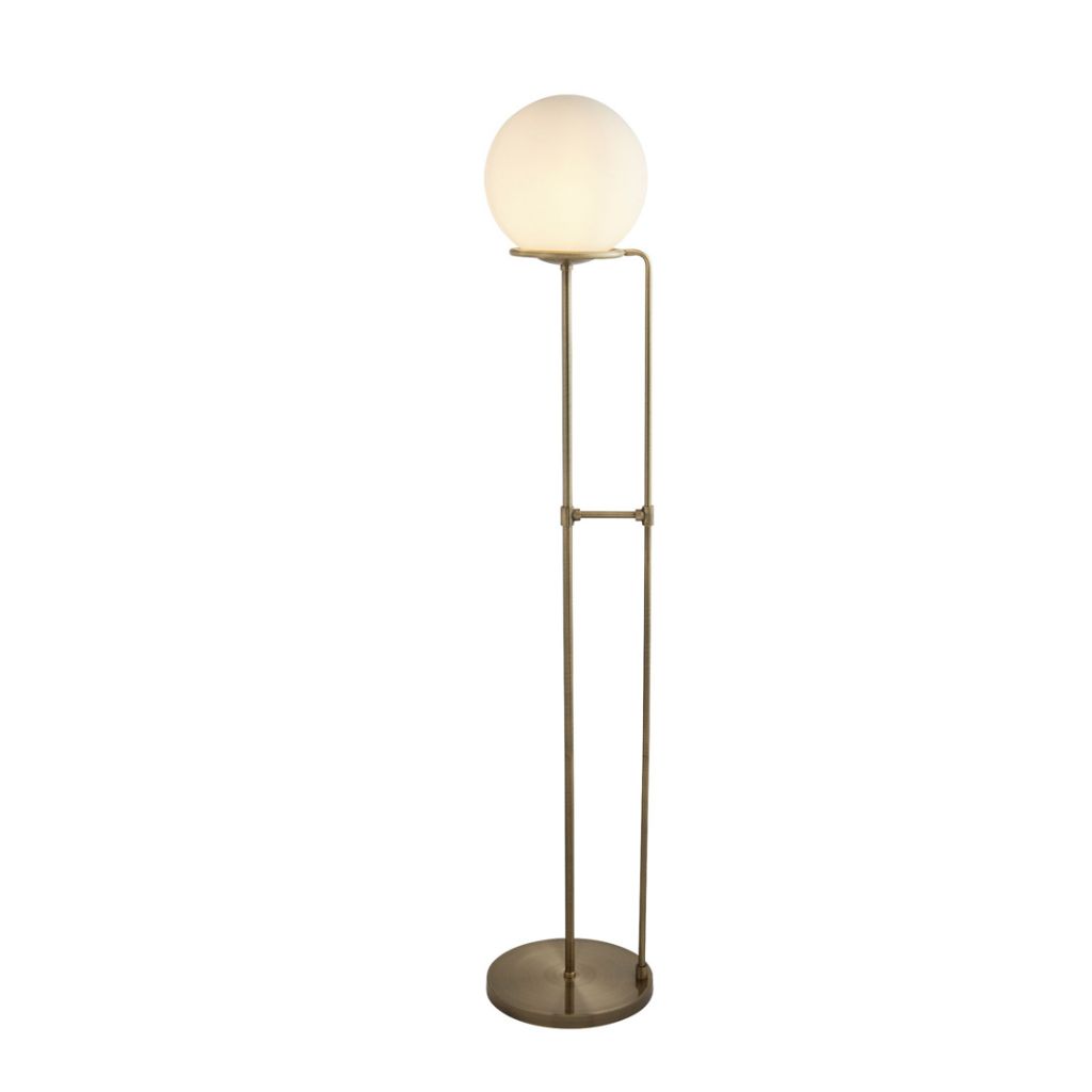 BERLIN 1x zdroj, stojací lampa, antická mosaz, černě opletený kabel, opálově bílé sklo stínidlo