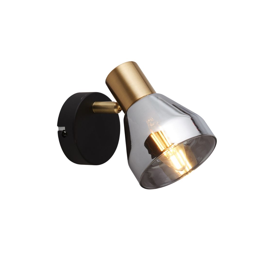 Nástěnné svítidlo na jednu žárovku. Působivé svítidlo s kouřovým skleněným stínidlem na černé základně s mosaznými detaily.