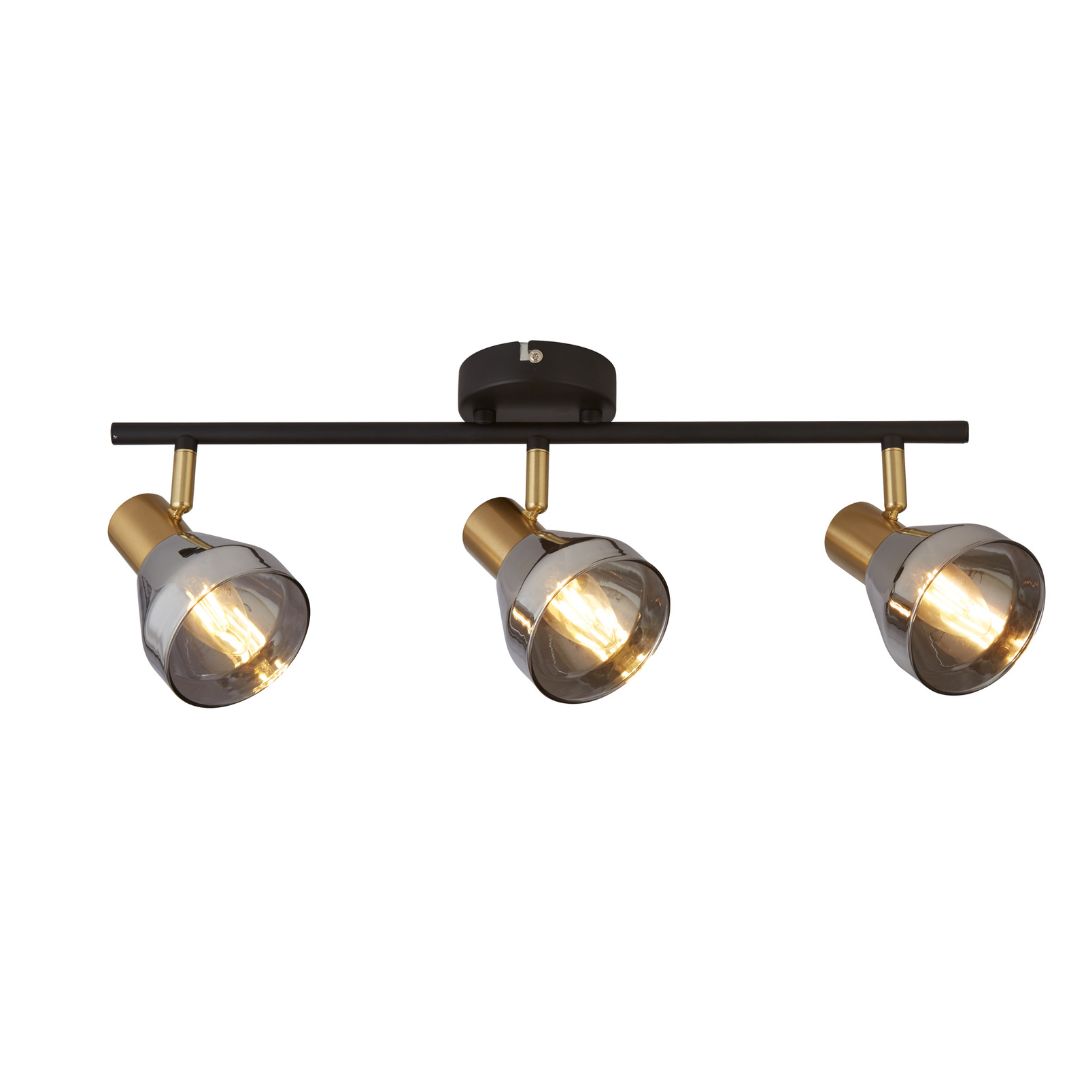 Stropní svítidlo na tři žárovky. Působivé svítidlo s kouřovým skleněným stínidlem na černé základně s mosaznými detaily.