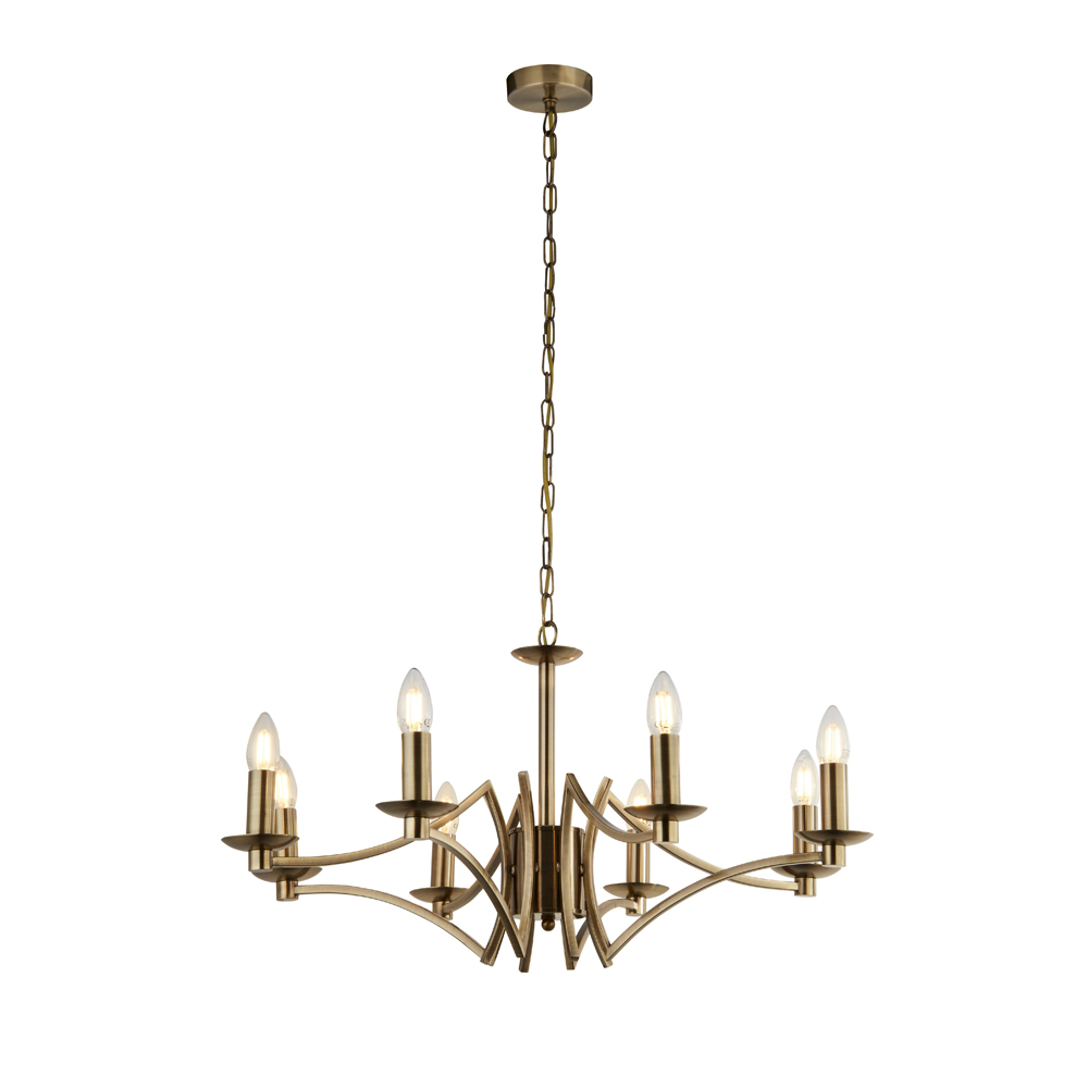 Závěsné svítidlo kov antická mosaz. Od stropu 150cm a průměr 72cm. Výška kostry lustru je 38cm. Patice pro zdroje E14 na max. 8x40W. Žárovky nejsou v balení. Lustr je z kolekce Ascot od výrobce svítidel z Anglie Searchlight.