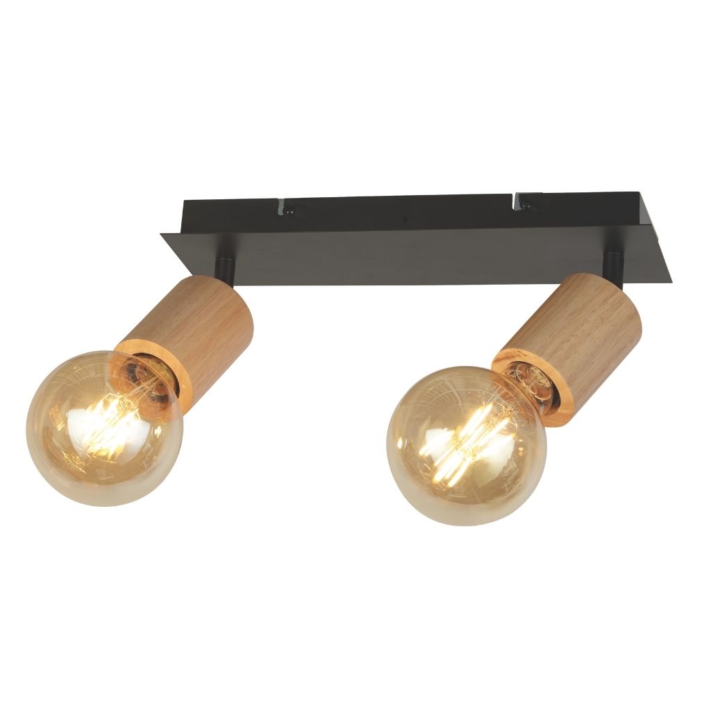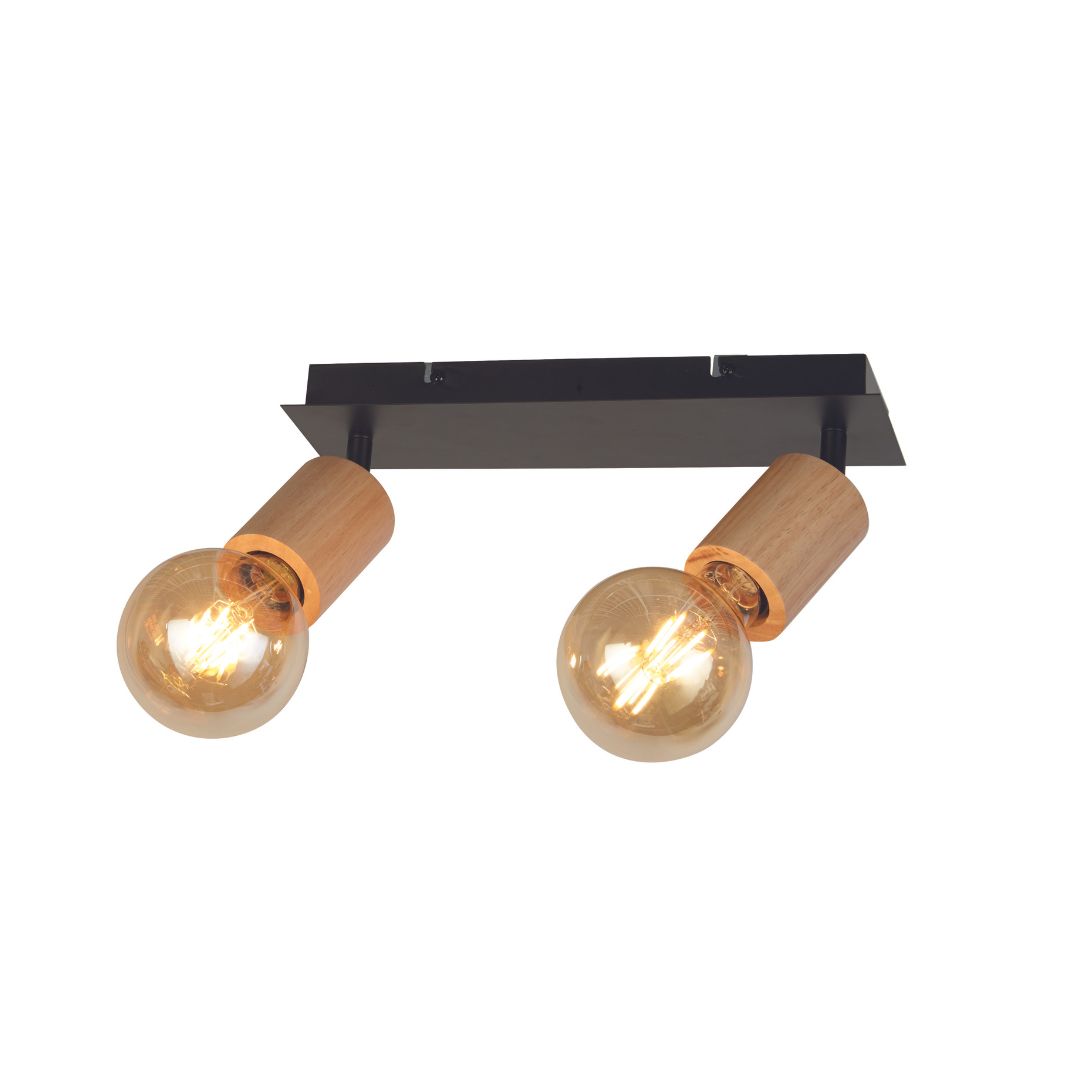 Stropní svítidlo kov černé matné barvy a dřevěné doplňky. Výška svítidla 15cm a šířka 43cm. Patice pro zdroj E27 na max. 2x60W. Žárovka není součást balení.