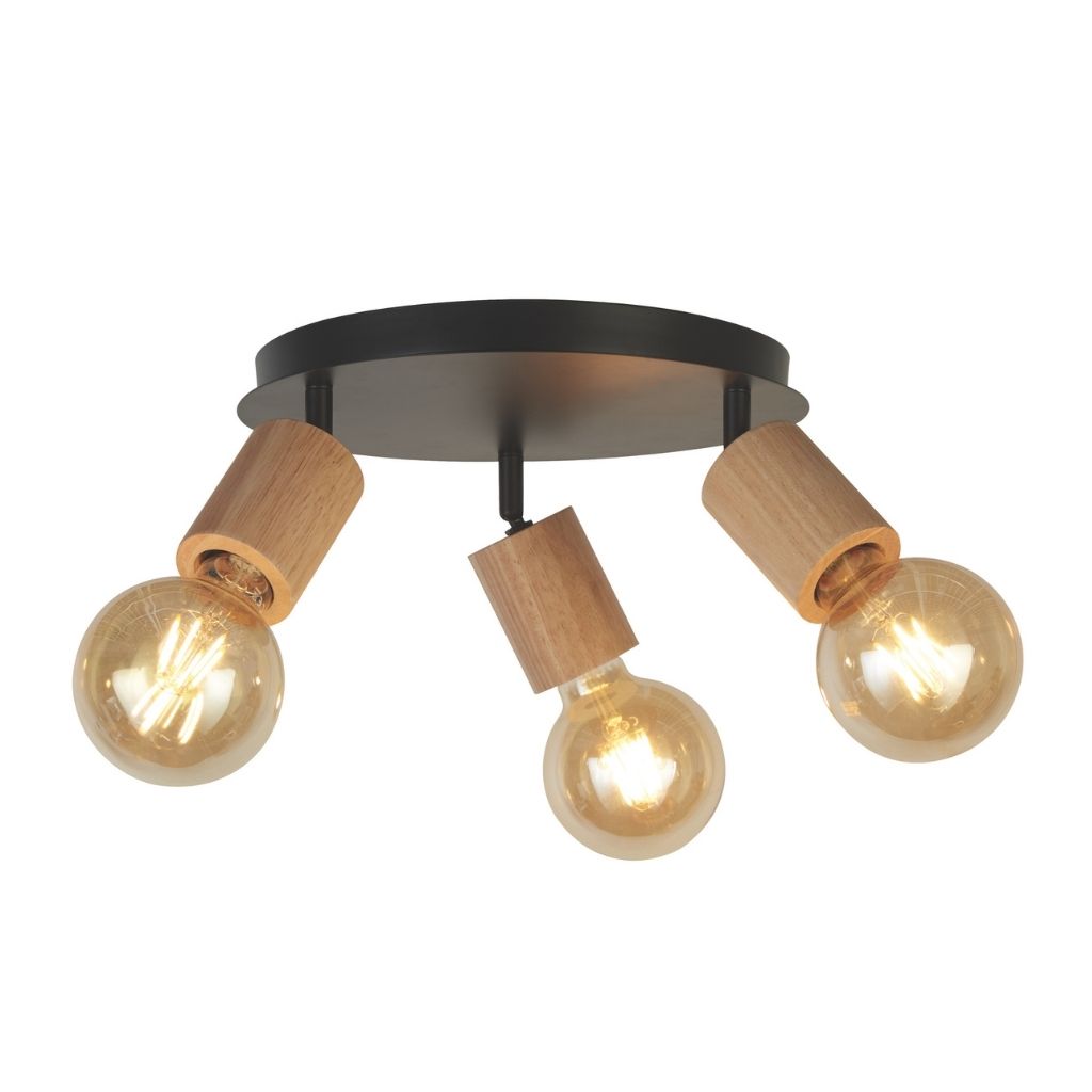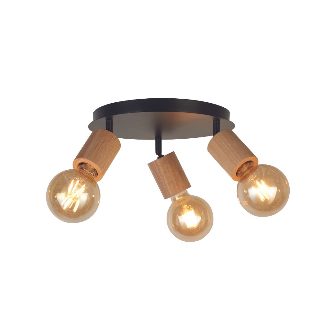 Stropní svítidlo kov černé matné barvy a dřevěné doplňky. Výška svítidla 15cm a šířka 35cm. Patice pro zdroj E27 na max. 3x60W. Žárovka není součást balení.