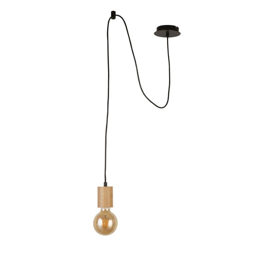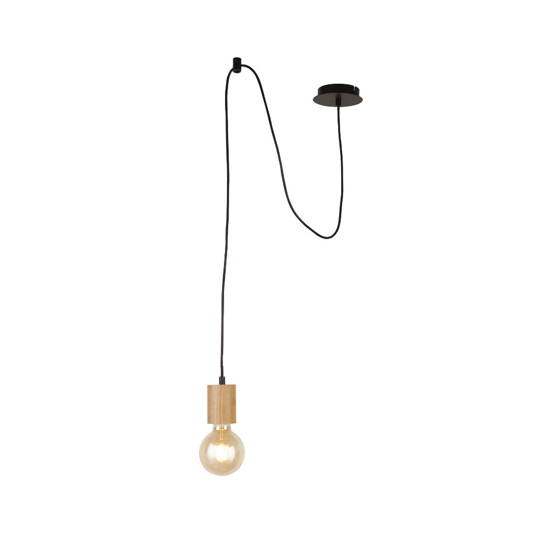 Závěsné svítidlo kov černé matné barvy a dřevěné doplňky. Výška svítidla 180cm a šířka 6cm. Patice pro zdroj E27 na max. 1x60W. Žárovka není součást balení.
