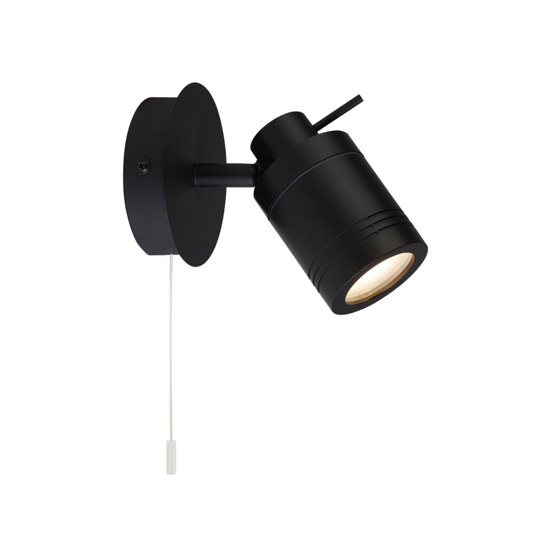 Bodovka s otočnou hlavou v černé barvě s krytím IP44. Šňůrkový vypínač. Vhodná do koupelny stejně jako ostatní svítidla z kolekce SAMSON.