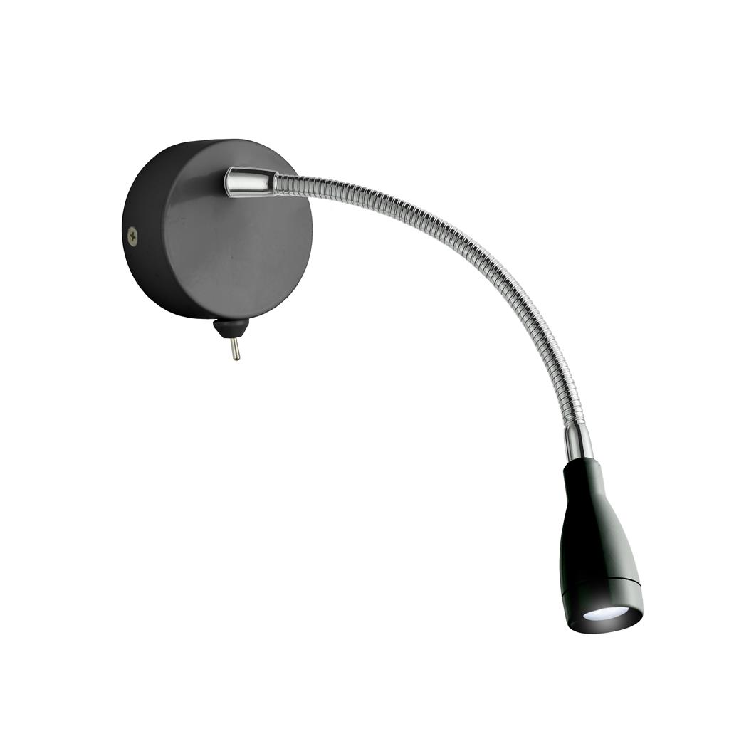 Svítidlo na stěnu s flexibilním ramínkem v kovu v černé barvě. Je vhodná na přisvícení do knížky nebo mobilu. Na kulaté základně je páčkový vypínač.