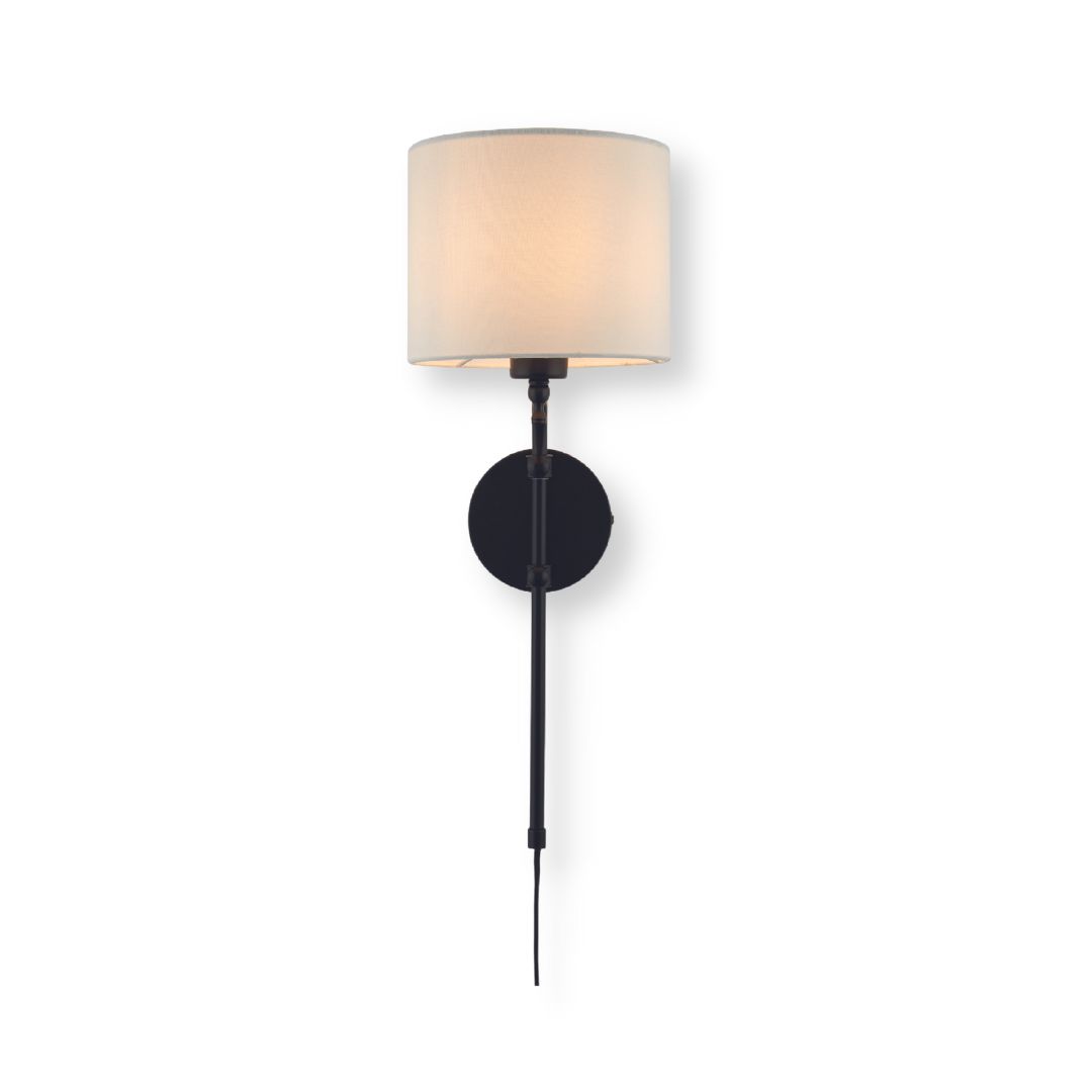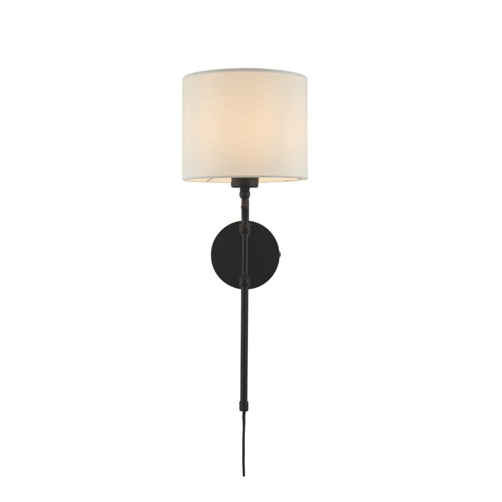 Svítidlo na stěnu v černé rustikální barvě připomínající zašlý starožitný kov. Stínidlo je textilní se strukturou lnu. Velmi zajímavý kousek, zapojuje se kabelem do zásuvky.