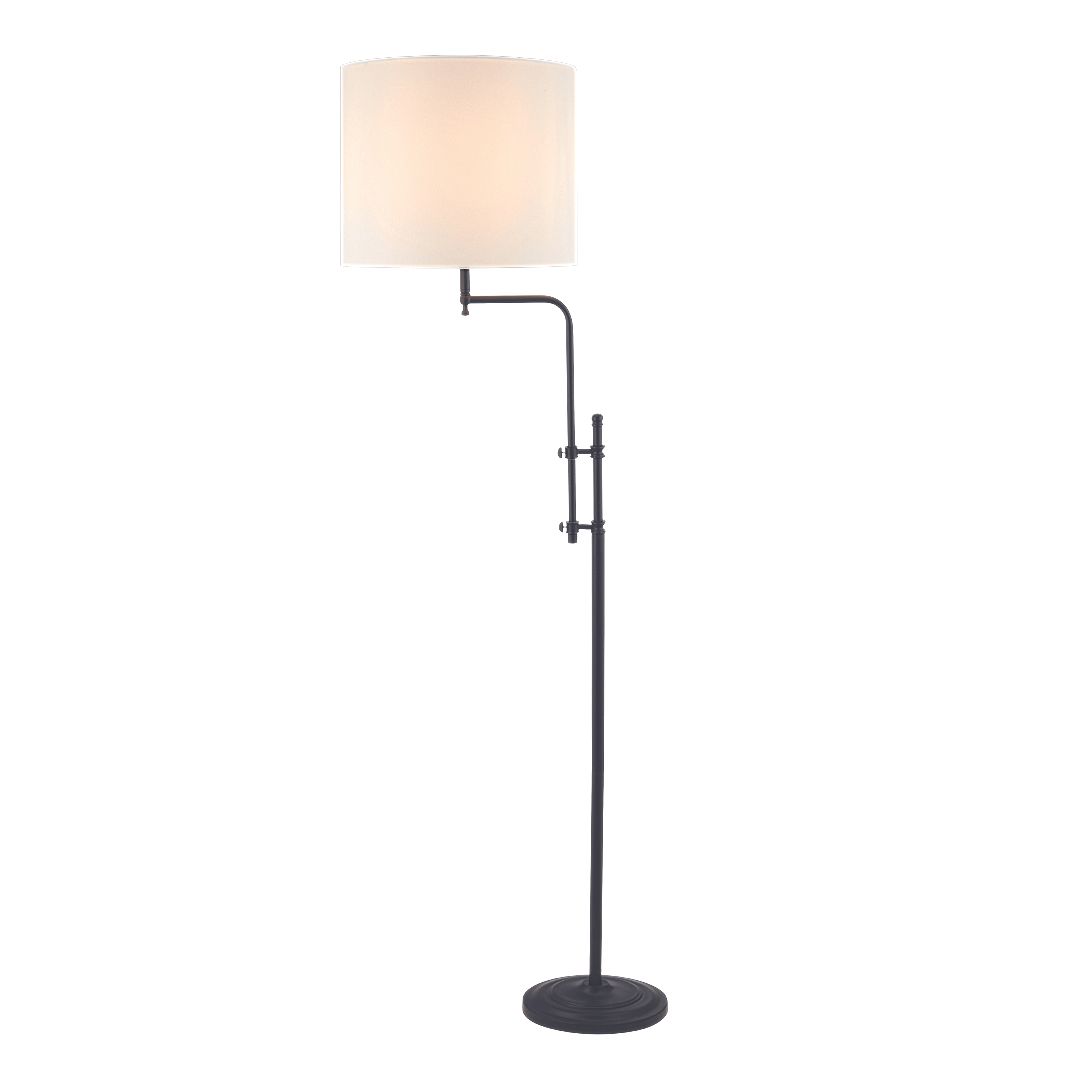 Svítidlo na zem jako stojací lampa v černé rustikální barvě připomínající zašlý starožitný kov. Stínidlo je textilní se strukturou lnu. Velmi zajímavý kousek, vypínač je nášlapný na kabelu.