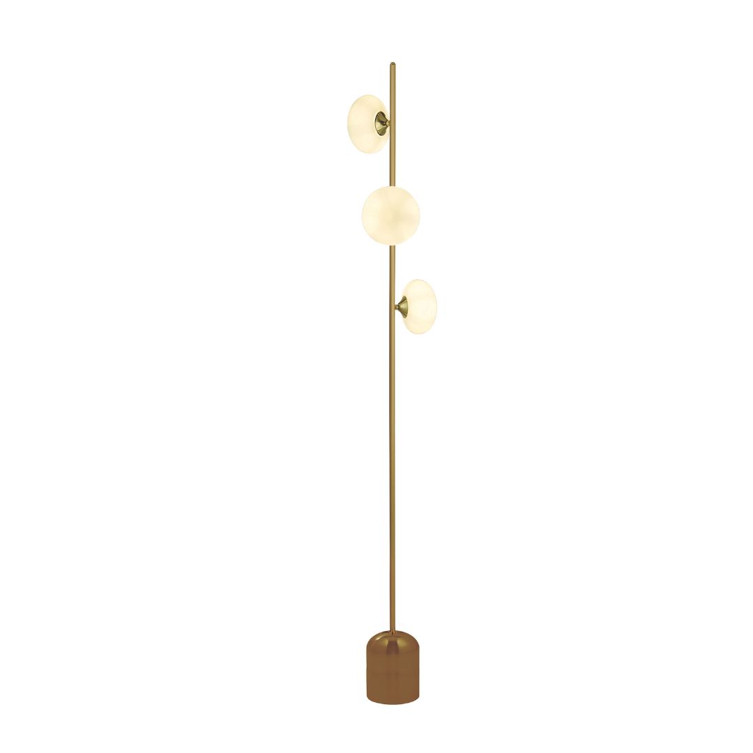 Stojací lampa v matované zlaté barvě a se skleněným stínidlem. Výška 170cm a průměr 20cm. Žárovka patice G9 na max. 3x33W. Ta není v balení. Výrobce je Searchlight a patří do kolekce Pebble.